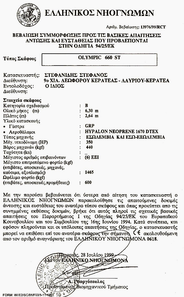 GREEK Certification of Conformity to the Basic Requirements of buoyancy and stability.